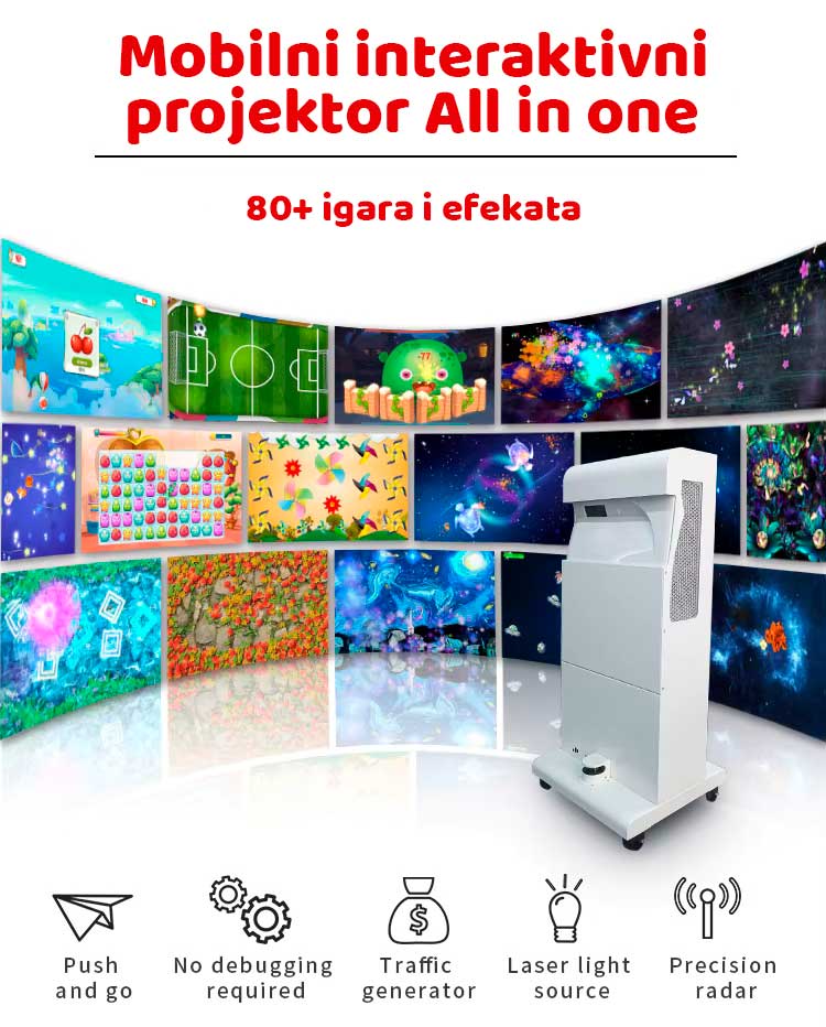 Napredni mobilni interaktivni floor projektor koji pretvara pod u dinamičnu, zabavnu i edukativnu interaktivnu površinu. Idealan je za dječje igraonice, škole, vrtiće, shopping centre, evente, hotele, restorane i promotivne aktivnosti.